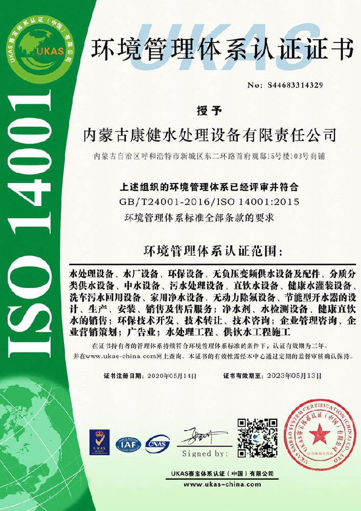 環(huán)境管理體系認證證書